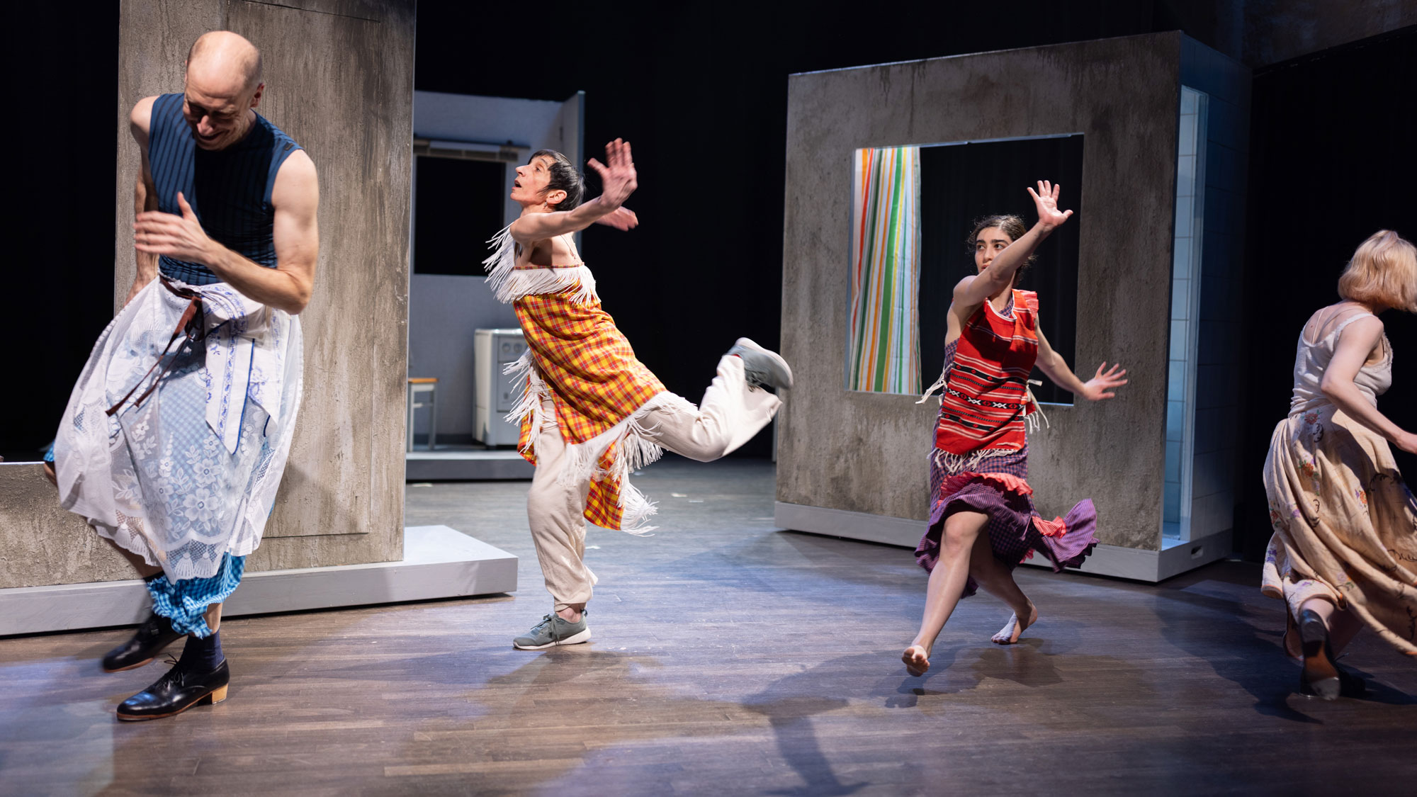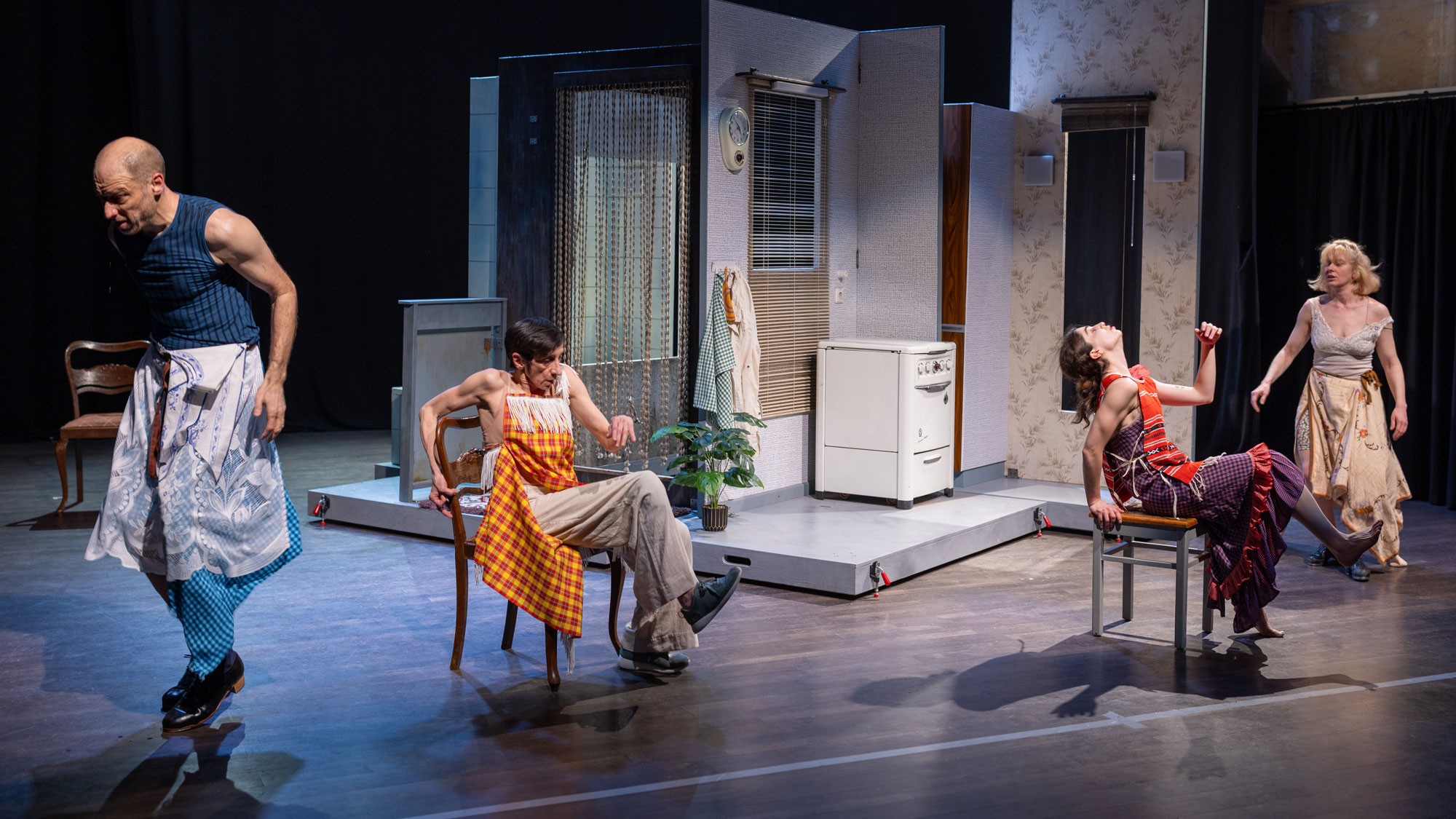 Vier Performer*innen bewegen sich durch ein Bühnenbild aus Herd, Badewanne, Dielenboden und anderen Erinnerungsstücken, die sich zu einer Heimat zusammenschieben lassen, in der Menschen und Erinnerungen auftauchen und verschwinden. Ein Puzzle aus traumlogischen Bildern, in denen Humor und Tragik in seltsamer Leichtigkeit zusammenkommen.